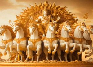 Sanjna, also known as Saranyu, is a prominent Hindu goddess and the chief consort of Surya Deva, the Sun god. She is first mentioned in the ancient Rigveda and later appears in various Hindu scriptures like the Harivamsa and the Puranas. Sanjna is the daughter of Tvashta, a craftsman deity often identified with Vishwakarma, the divine architect. Unable to bear Surya’s intense heat and brilliance, Sanjna temporarily abandoned her husband, seeking respite from his overwhelming radiance.
